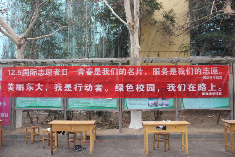 12月5日,国际商学院实践与志愿服务部在校园开展了“美丽东大•我是行动者”志愿服务宣传活动,呼吁全校学生积极参加志愿活动,树立保护校园环境、为他人服务的意识。