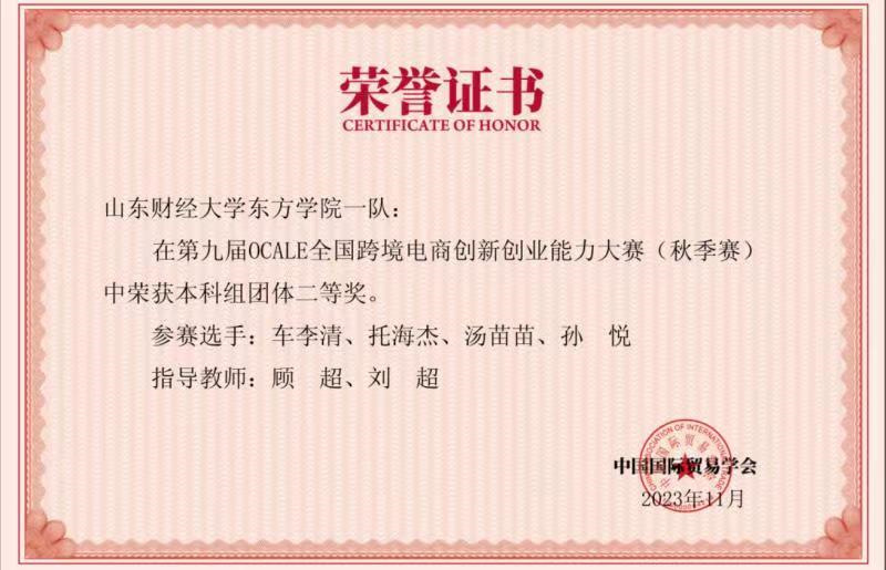 2023年11月24日,第九届OCALE全国跨境电商创新创业能力大赛落下帷幕。此次大赛共有来自全国504所院校的2486支队伍参赛,国际商学院选派两支队伍参赛,选手们凭借扎实的专业功底和出色的实践能力荣获佳绩。由李萍和甄程成老师指导的张圆、韩雪苹、李嘉琦、李会丽组成的“hjc222黄金城官网二队”获得全国本科组团体特等奖,由顾超和刘超老师指导的车李清、托海杰、汤苗苗、孙悦组成的“hjc222黄金城官网一队”获得本科组全国团体二等奖。