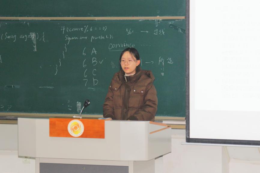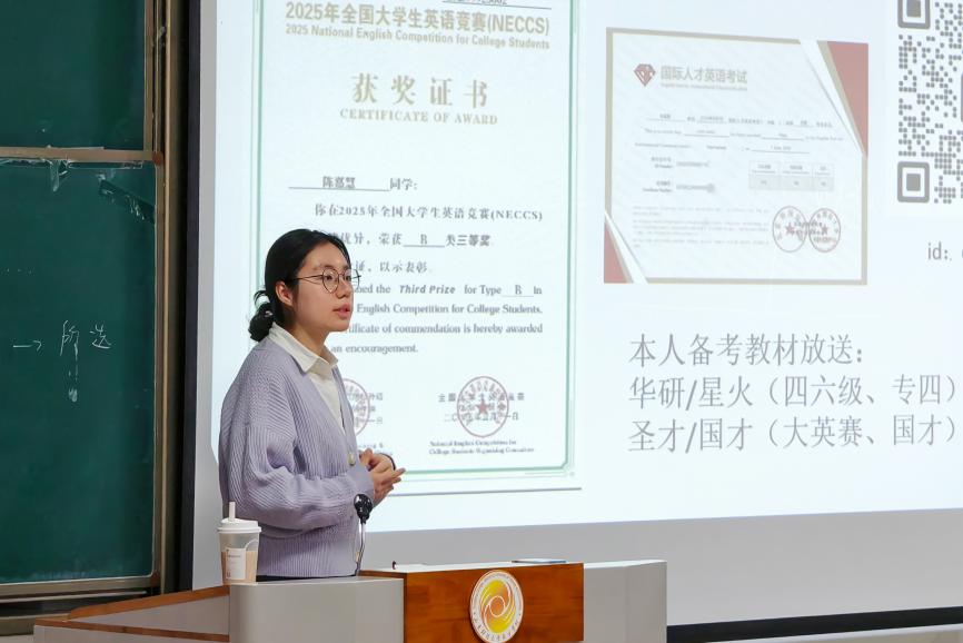 陈嘉慧分享了英语类考试的备考心得与建议。首先从考试题型、分数及时间分配等方面对考试进行分析,接着根据英语考试必备的知识展开具体的经验分享和总结。王天乐从课程学习的总体建议、核心课程学习攻略、通用课程学习技巧、总体建议四个方面分享了国际商务专业学习的相关经验。